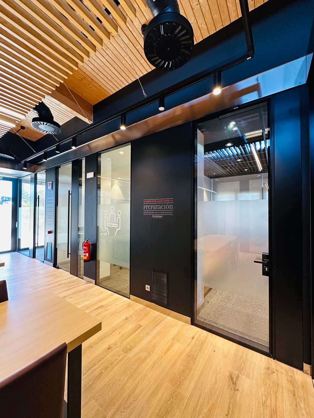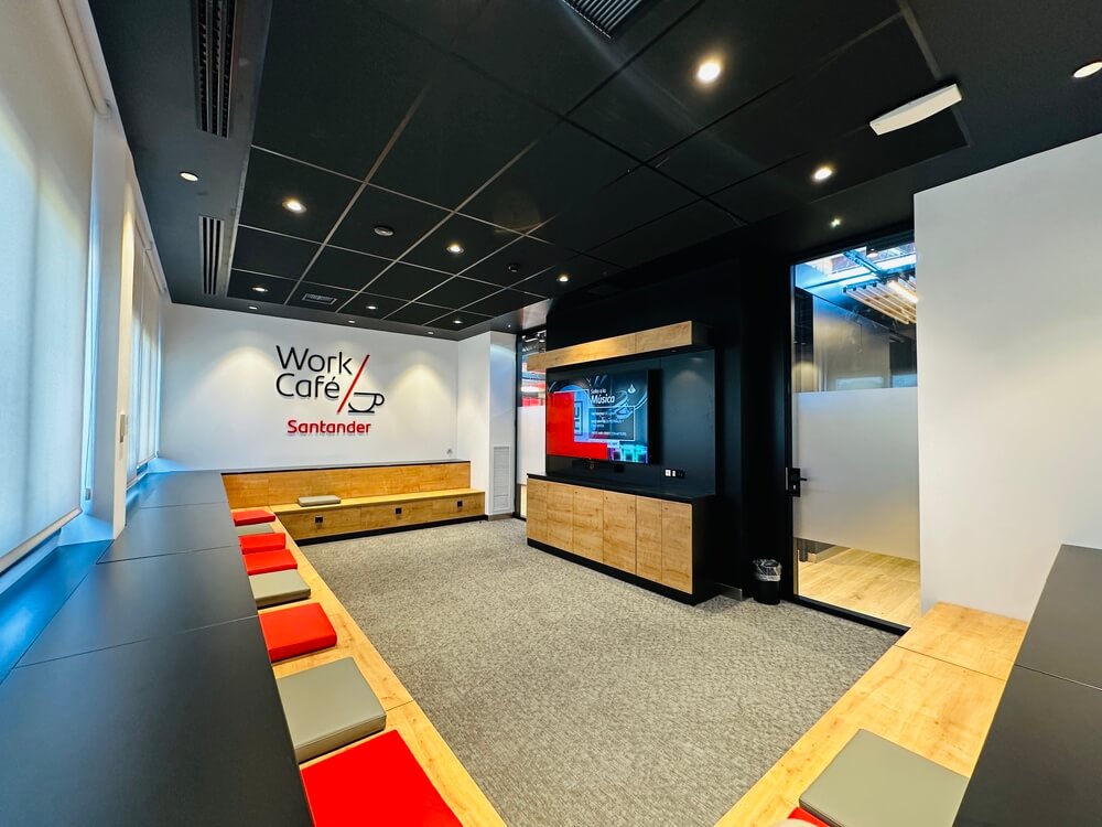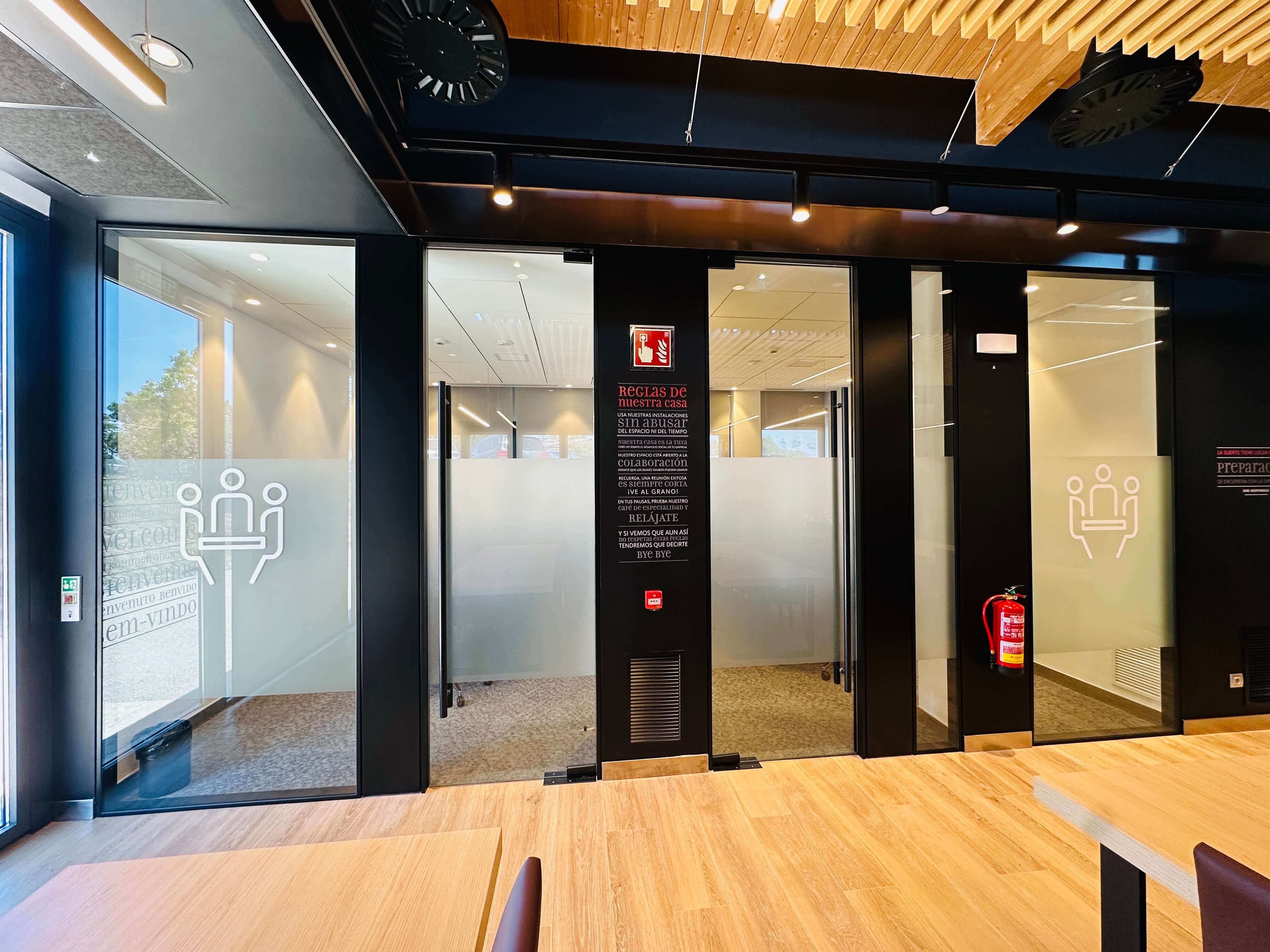 El proyecto destaca por su sistema de mamparas de doble vidrio con perfilería negro mate ST-200 de la serie Trebe de SITAB, junto con las puertas de doble vidrio enrasado ST-440 y puertas especiales según libro de estilo Banco Santander.