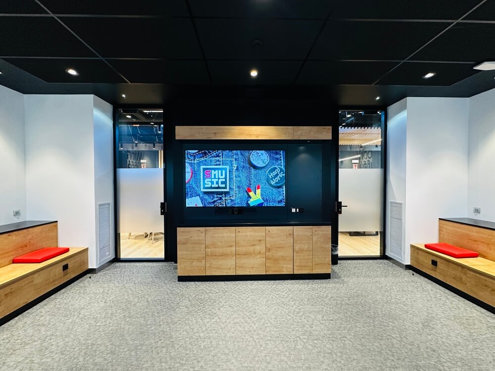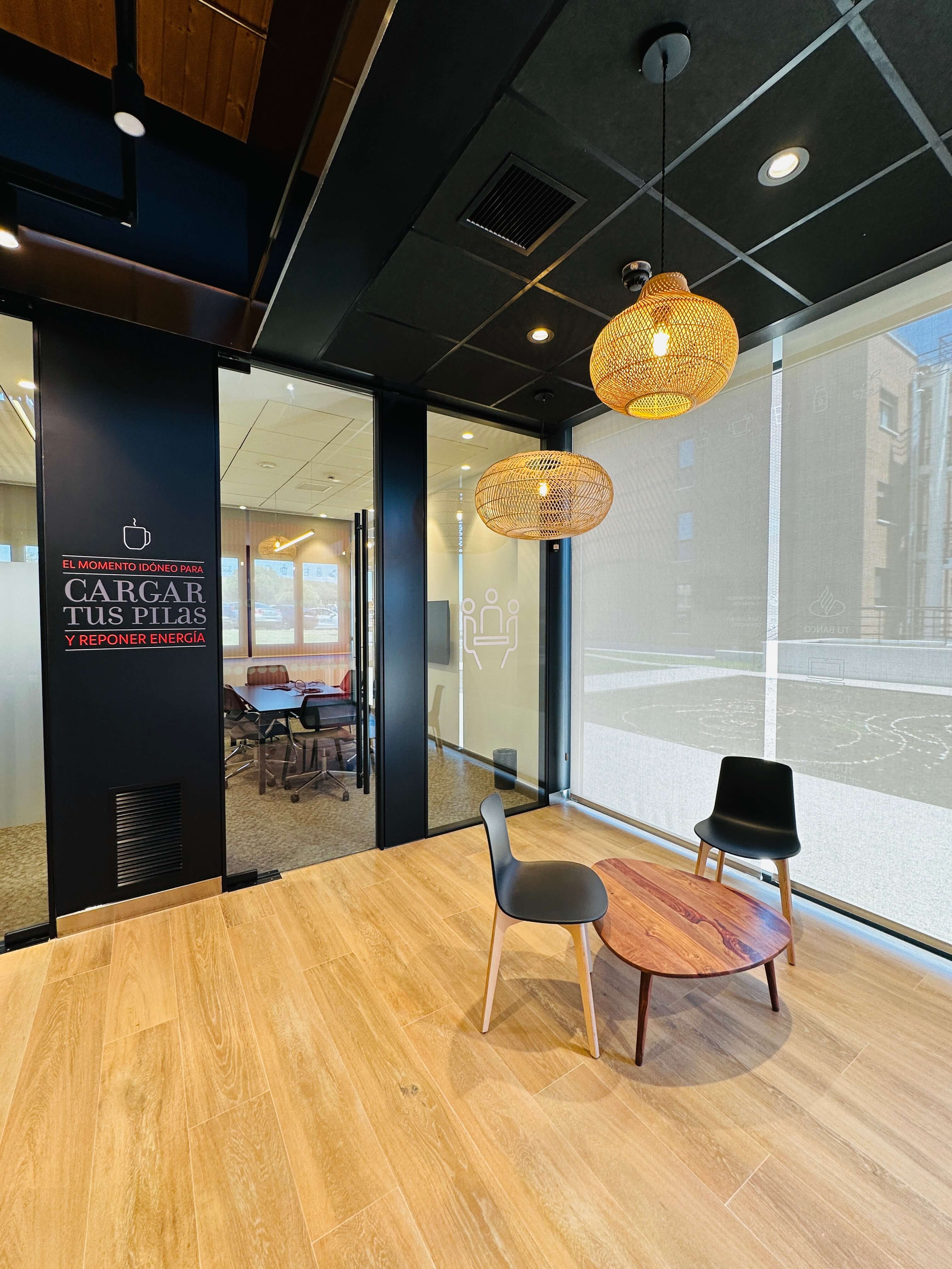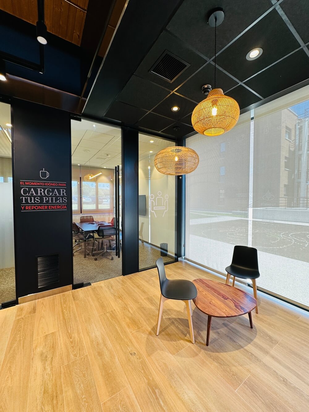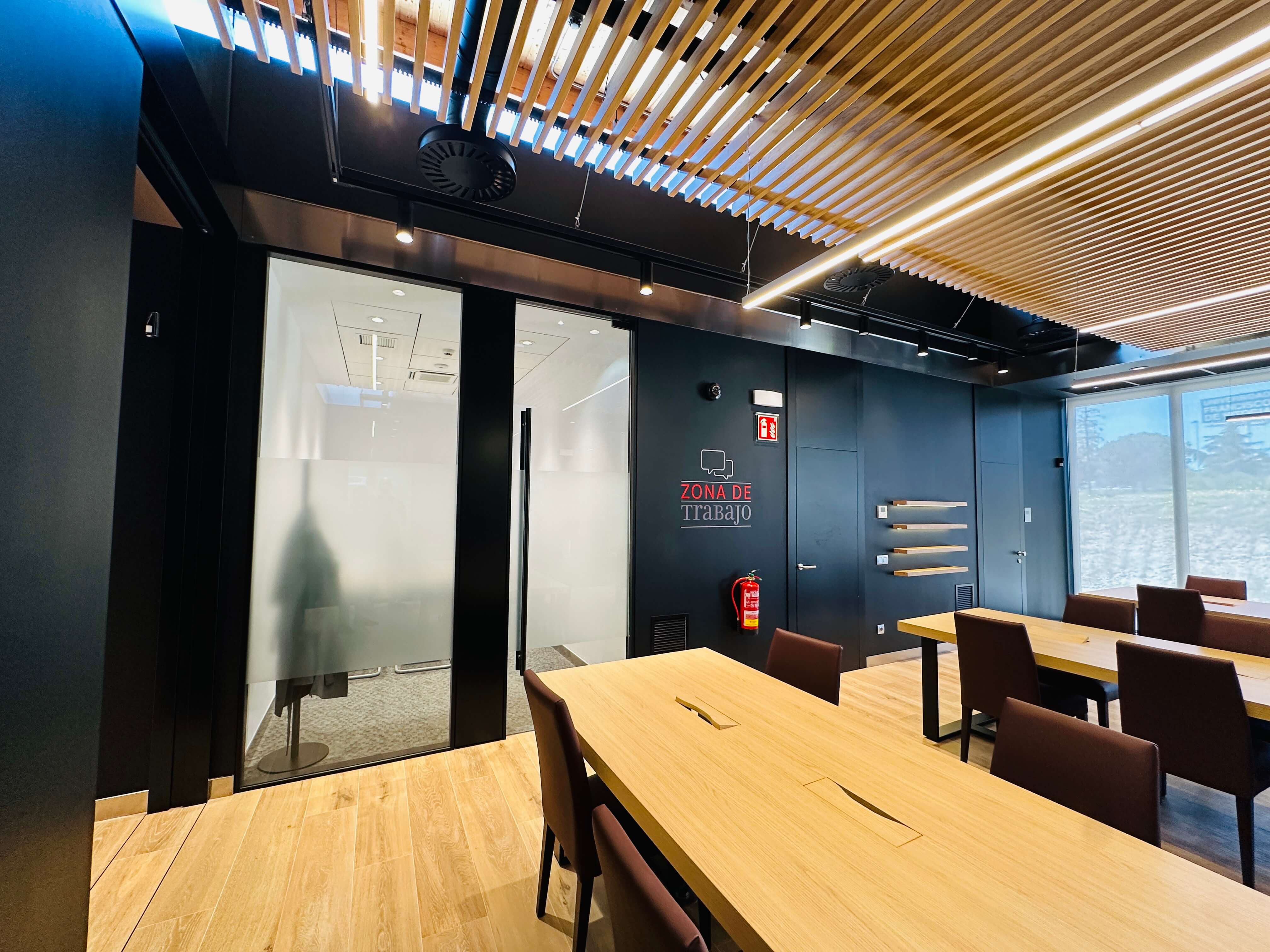 El proyecto destaca por su sistema de mamparas de doble vidrio con perfilería negro mate ST-200 de la serie Trebe de SITAB, junto con las puertas de doble vidrio enrasado ST-440 y puertas especiales según libro de estilo Banco Santander.